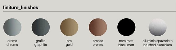 Finitura Grafite, Oro, Bronzo, Nero Matt, Alluminio Spazzolato.